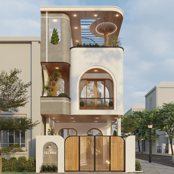 Mặt tiền ấn tượng với đường nét kiến trúc độc đáo, kết hợp hài hòa giữa kính, mảng xanh và chi tiết trang trí sang trọng.