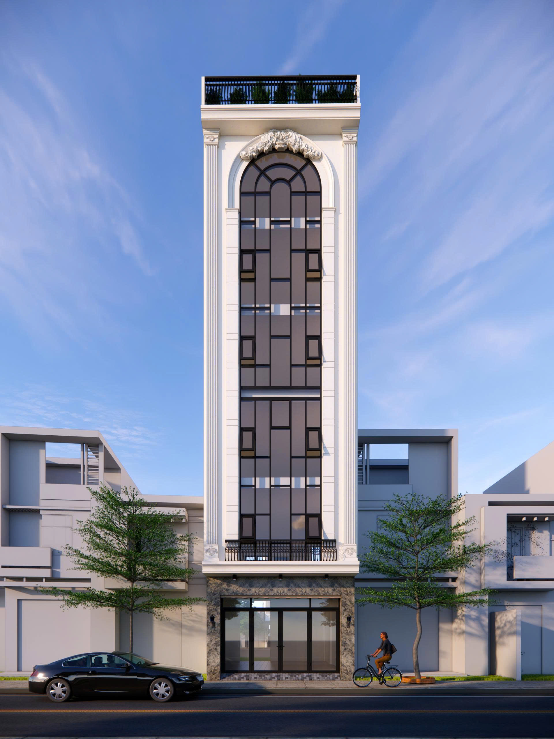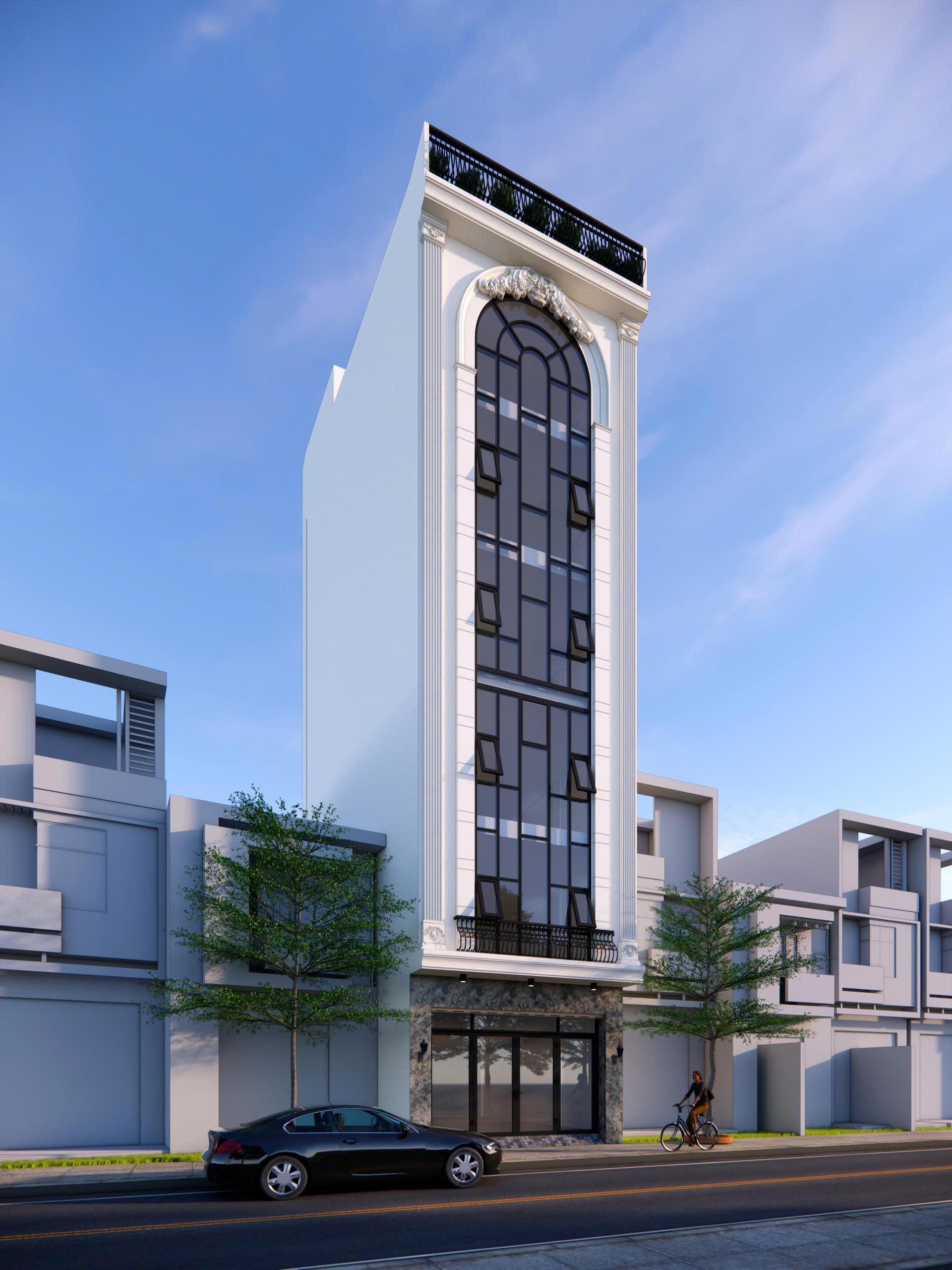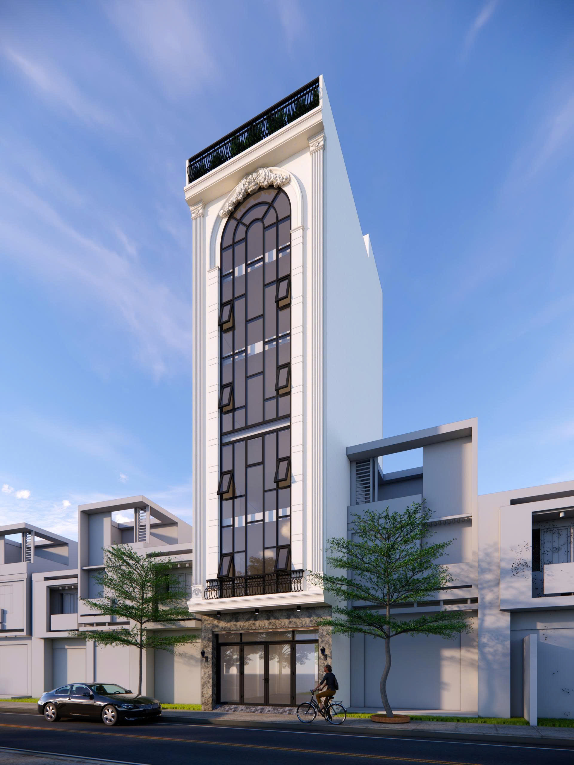 Mặt tiền ấn tượng với đường nét kiến trúc độc đáo, kết hợp hài hòa giữa kính, mảng xanh và chi tiết trang trí sang trọng.