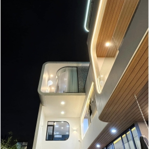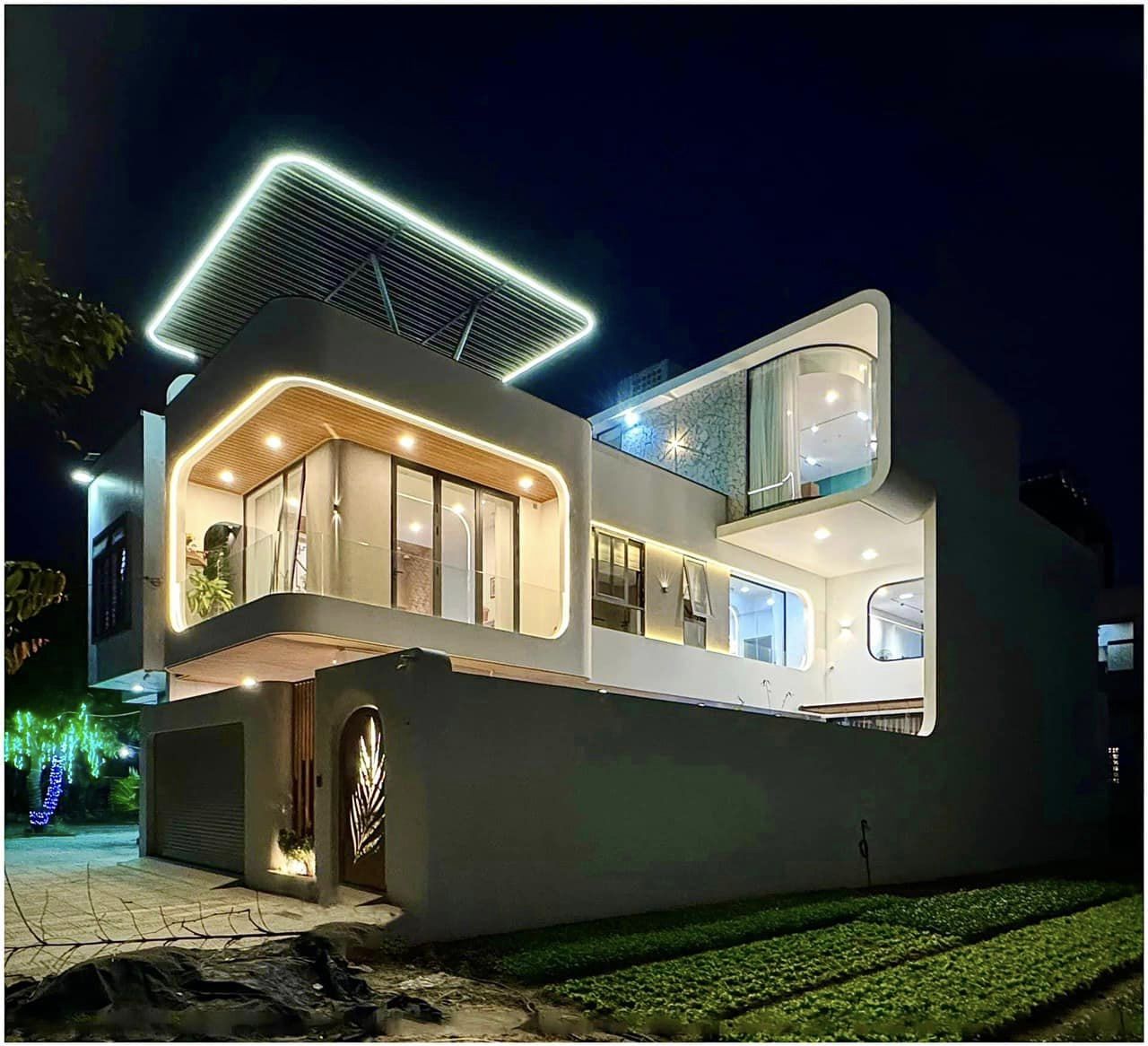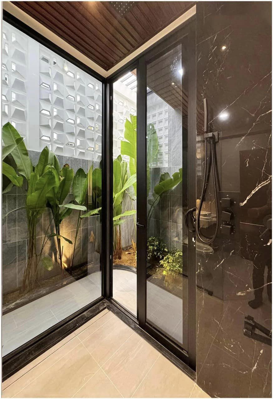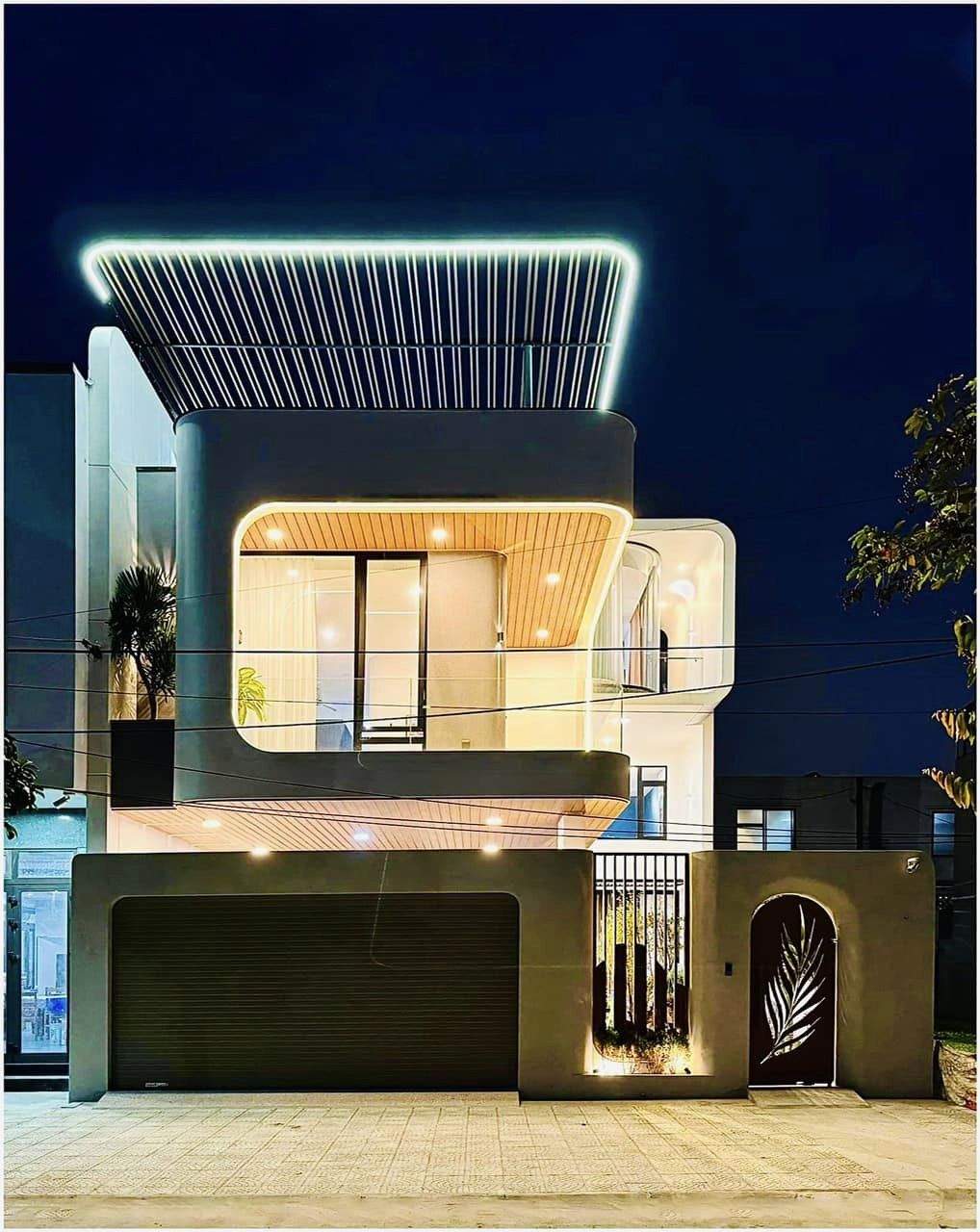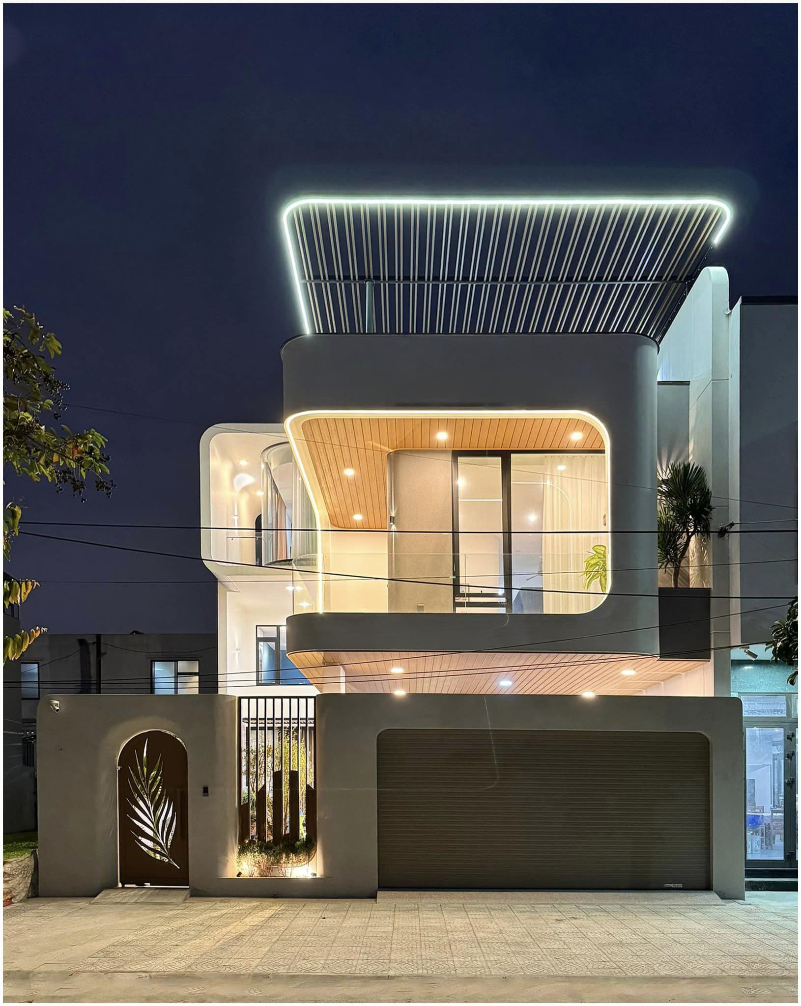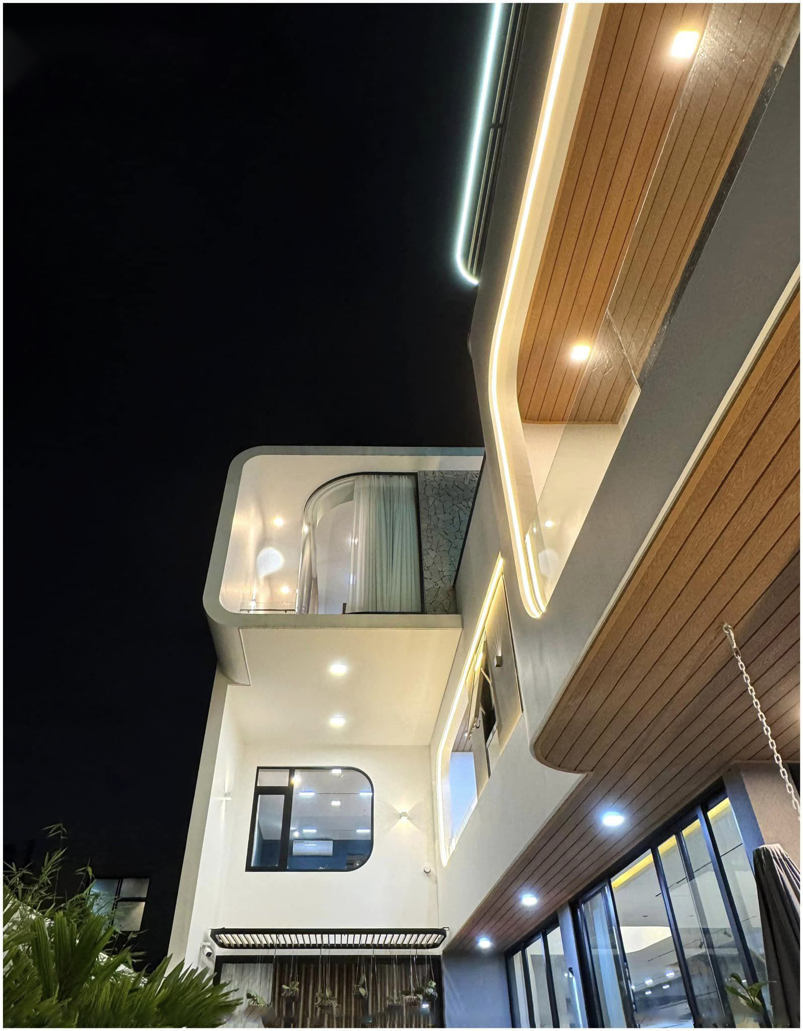 Mặt tiền ấn tượng với đường nét kiến trúc độc đáo, kết hợp hài hòa giữa kính, mảng xanh và chi tiết trang trí sang trọng.