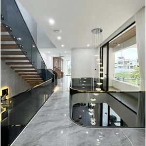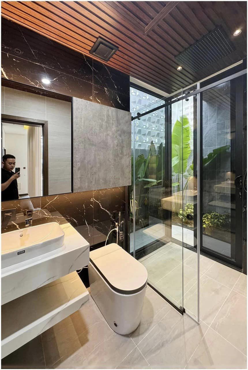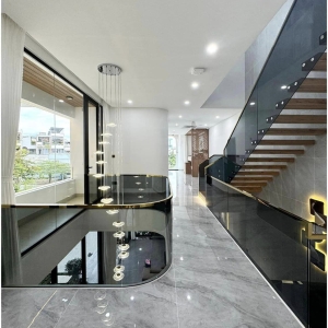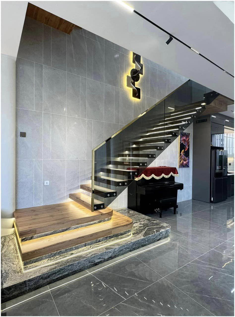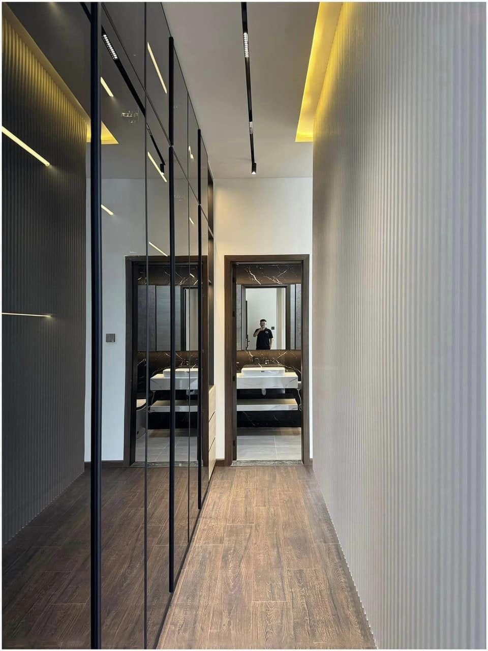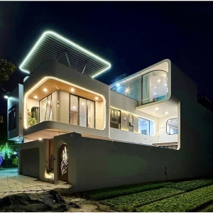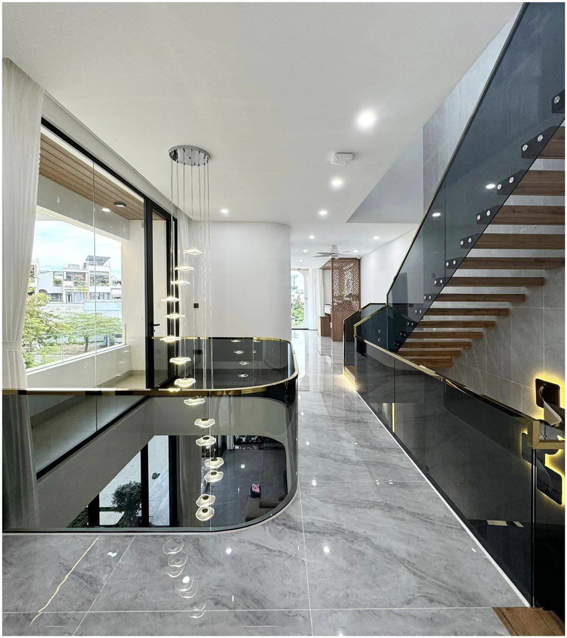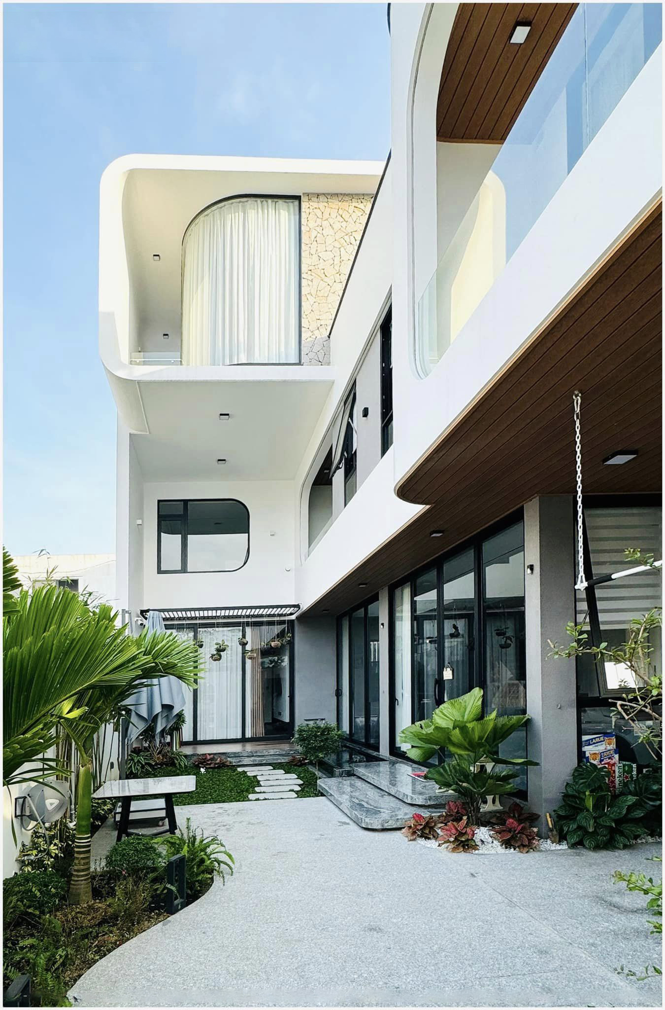 Mặt tiền ấn tượng với đường nét kiến trúc độc đáo, kết hợp hài hòa giữa kính, mảng xanh và chi tiết trang trí sang trọng.