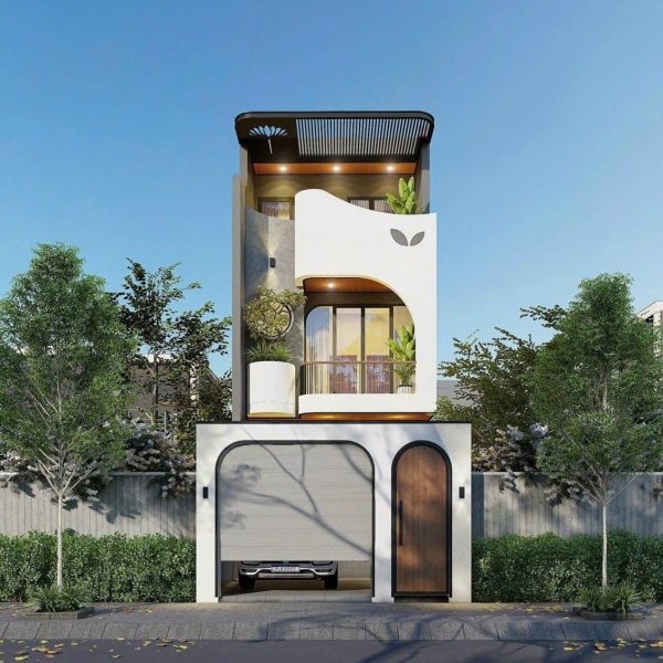 Mặt tiền ấn tượng với đường nét kiến trúc độc đáo, kết hợp hài hòa giữa kính, mảng xanh và chi tiết trang trí sang trọng.